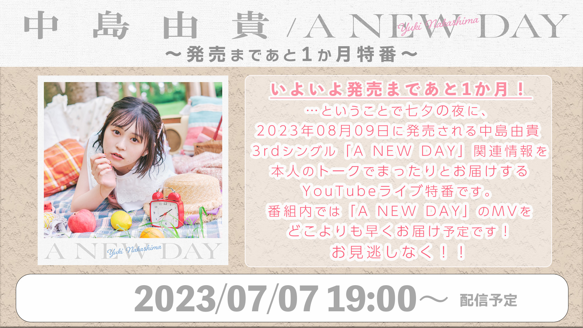 2023年7月7日20:00~ 中島由貴/A NEW DAY~発売まであと1か月特番~【YouTubeライブ配信】